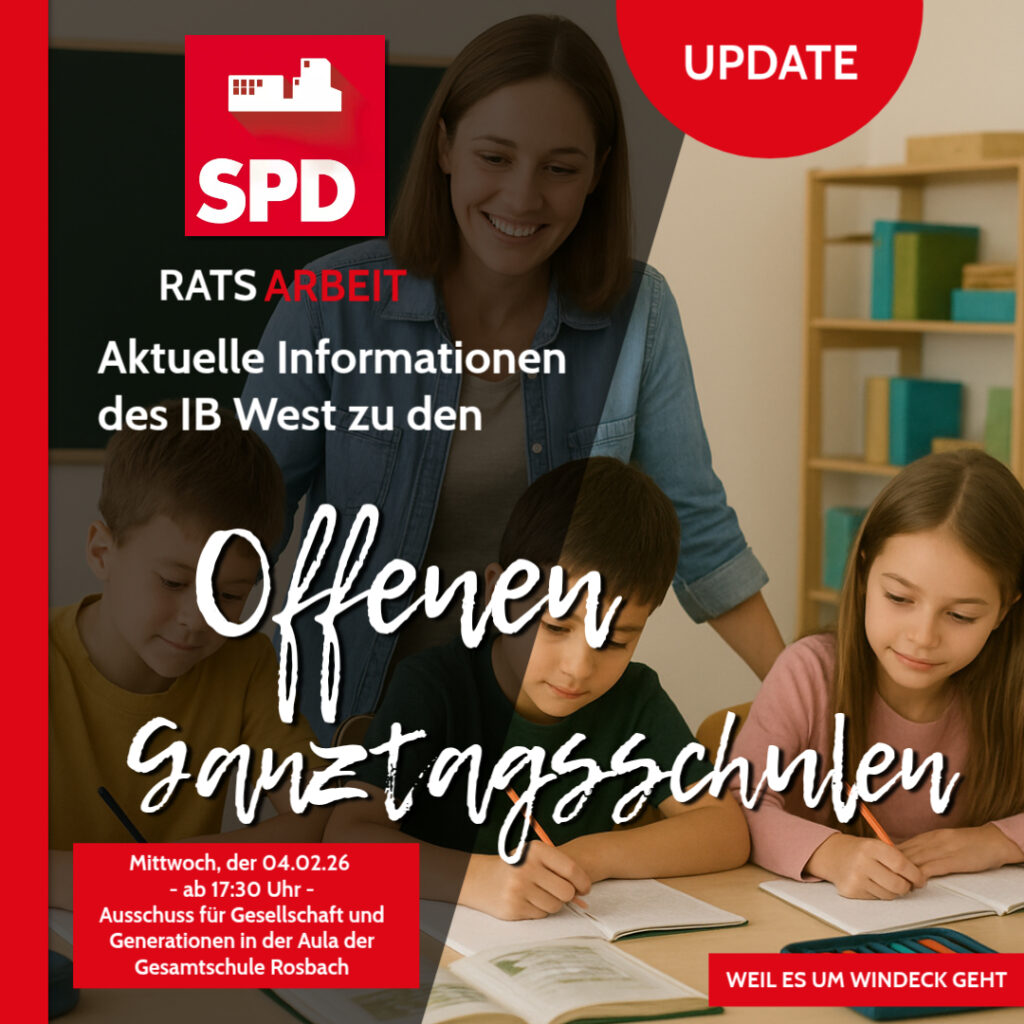 Die SPD Windeck hat bereits im Dezember 2025 mit einem klaren politischen Impuls gehandelt: Mit unserem Antrag zur Erstellung eines Notfallkonzepts für die Offenen Ganztagsschulen wollten wir sicherstellen, dass die Betreuung der Kinder auch dann gewährleistet bleibt, wenn der aktuelle Träger – die IB West gGmbH – organisatorisch oder finanziell ins Straucheln geraten sollte. Dieser Vorstoß war eine direkte Reaktion auf zahlreiche Rückmeldungen aus Elternschaft, Schulen und Mitarbeiterschaft, die auf wachsende Unsicherheiten im laufenden Betrieb hinwiesen. Nun zeigt sich, wie … [weiterlesen]
