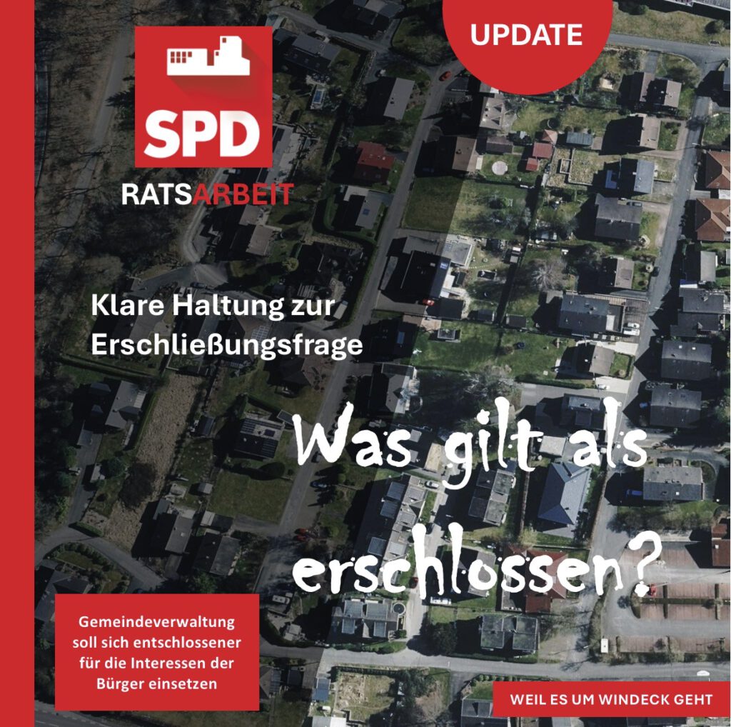 Wir machten deutlich, dass sie die Vorlage des Tagesordnungspunktes überrascht. Nach den bisherigen Diskussionen sei zu erwarten gewesen, dass sich die Verwaltung vor die Bürgerinnen und Bürger stellt und die Sanierung der seit Jahrzehnten bestehenden Straßen bei der NRW-Bank beantragt. Viele dieser Straßen wurden vor über 60 Jahren gebaut, geteert, mit Versorgungsleitungen versehen und dem öffentlichen Verkehr übergeben. Sie nun als „nicht erschlossen“ zu bewerten, widerspricht nach Auffassung der SPD dem Grundsatz der Rechtssicherheit.